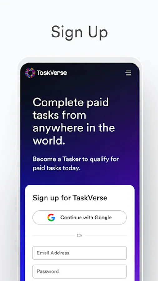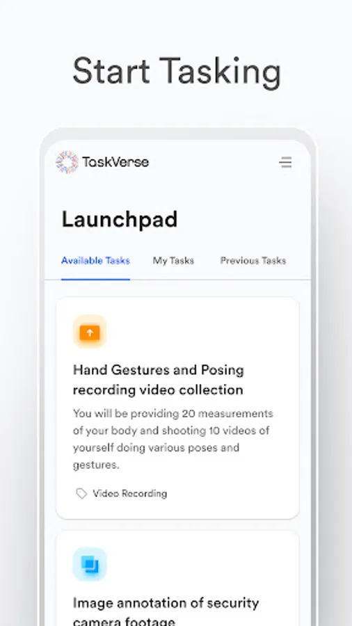 TaskVerse is an app that allows you to pick up and complete paid tasks from anywhere in the world using your smartphone. As a Tasker, you can participate in simple tasks such as recording simple videos, transcribing audio, tagging words, and more.