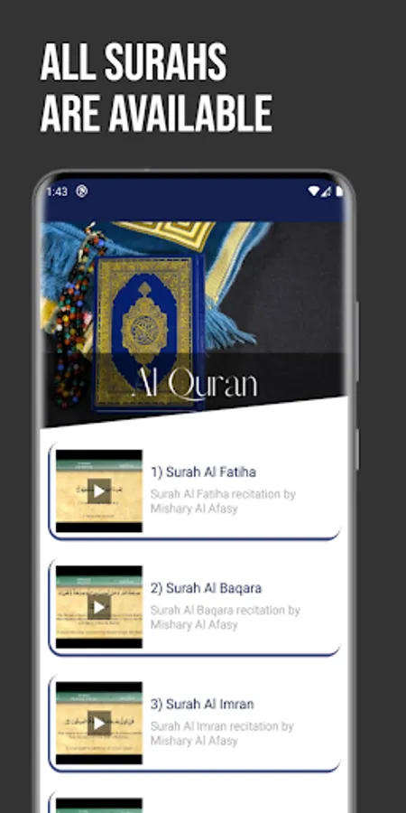Al Quran Video is a simple app to listen Holy Quran from video. This app is intended for all people to learn and listen Holy Quran easily through video. This app uses the internet for playing each surah. This app contains a complete recitation of the Al Quran. There are recitations of 4 different reciters. There are separate videos for every surah.