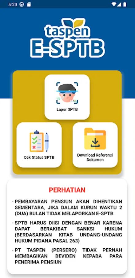 Electronic-SPTB (E-SPTB) is an electronic letter that is used for Supervision by PT TASPEN (Persero) in order to ensure that the Pension Recipient is entitled or is still alive and is used to update personal data and family data of the pension recipient.