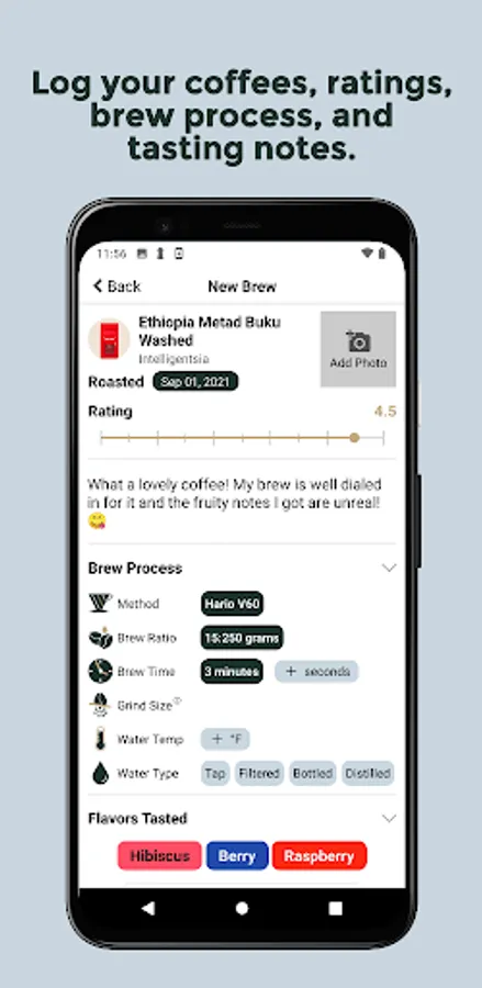 - Log and rate your brews - record the details of your brewing process (such as brewer, water to grounds ratio, brew time, and more), the flavors you are tasting, and scoring notes like a coffee professional.