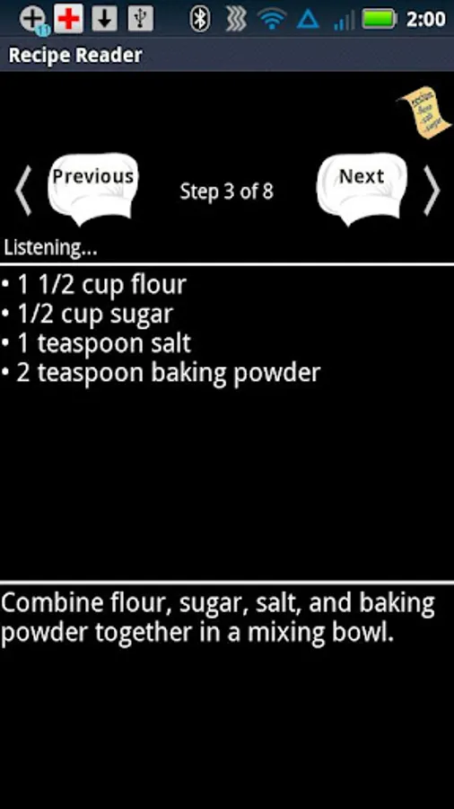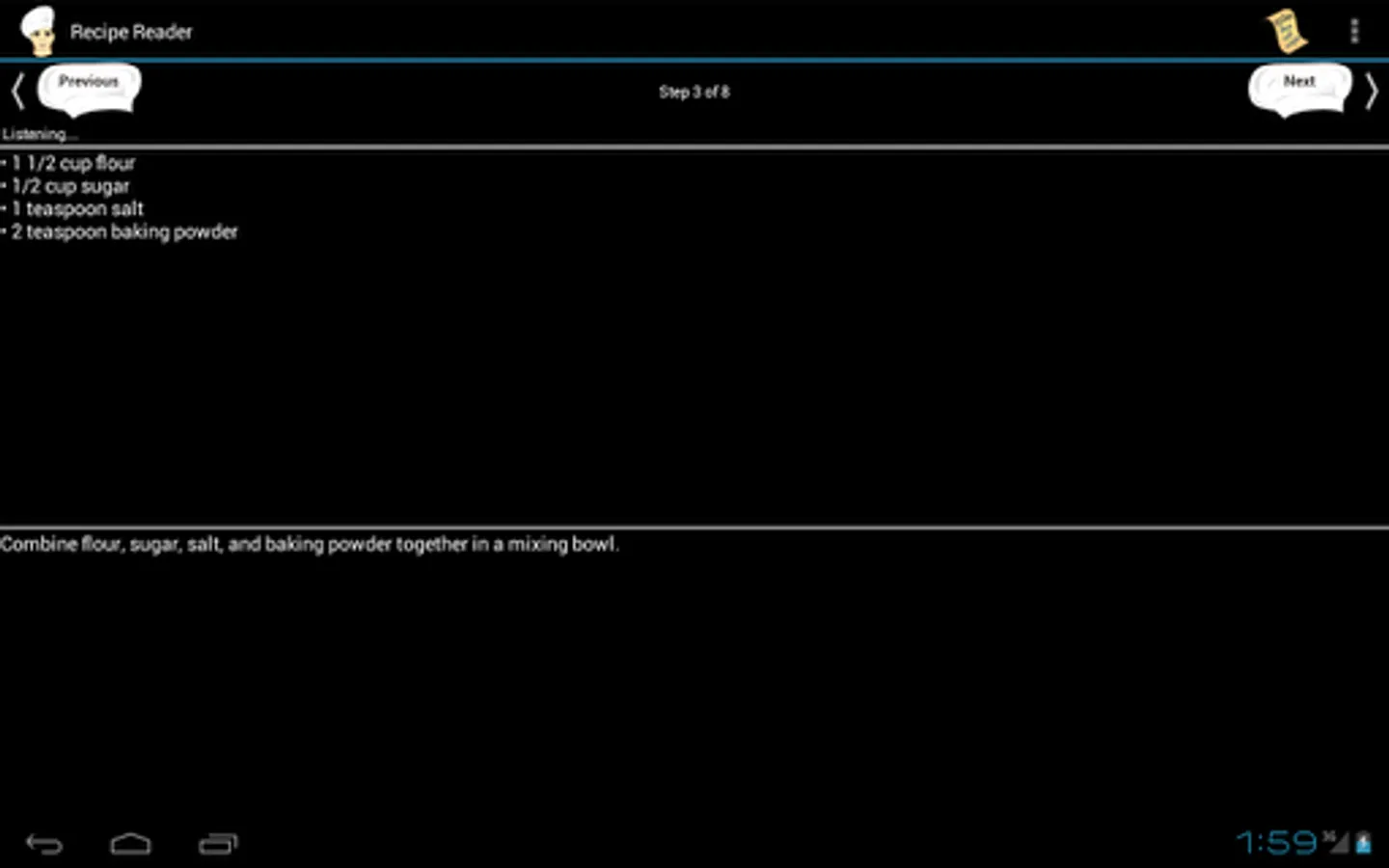 Assists cooking: Reads recipe steps and ingredients. Tracks current step.