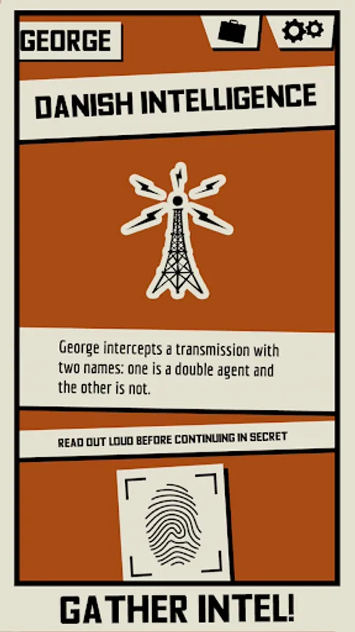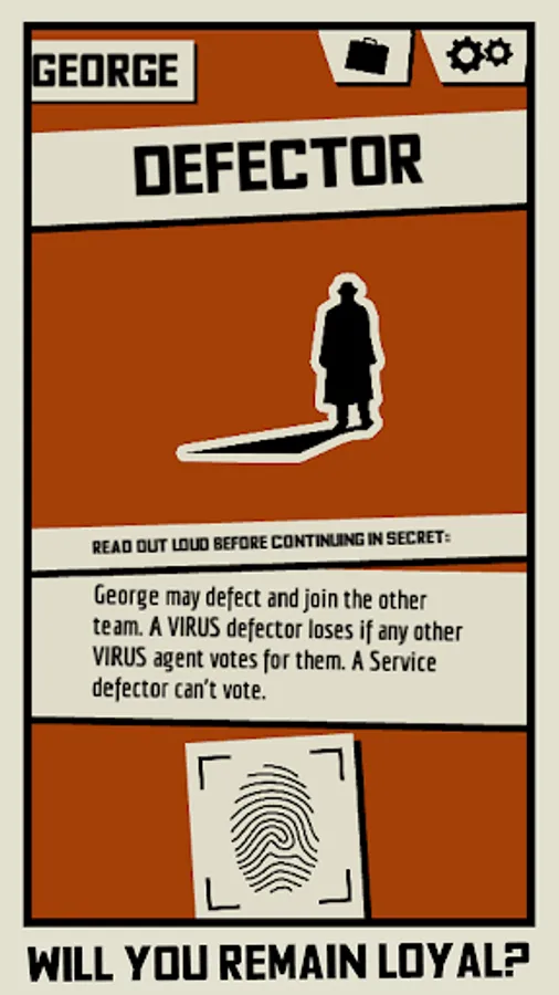 Pass the device around as you get events that can reveal information about other players, change your team, or give you a completely new win condition. Information is revealed secretly and it is up to each player how much they reveal. As a VIRUS double agent, this is your opportunity to sow doubt about other players. As a Service agent, you need to be careful not to reveal anything that the VIRUS might use against you. At the end of the game each player votes on who to imprison. If a double agent is imprisoned, the Service wins. Otherwise VIRUS does.