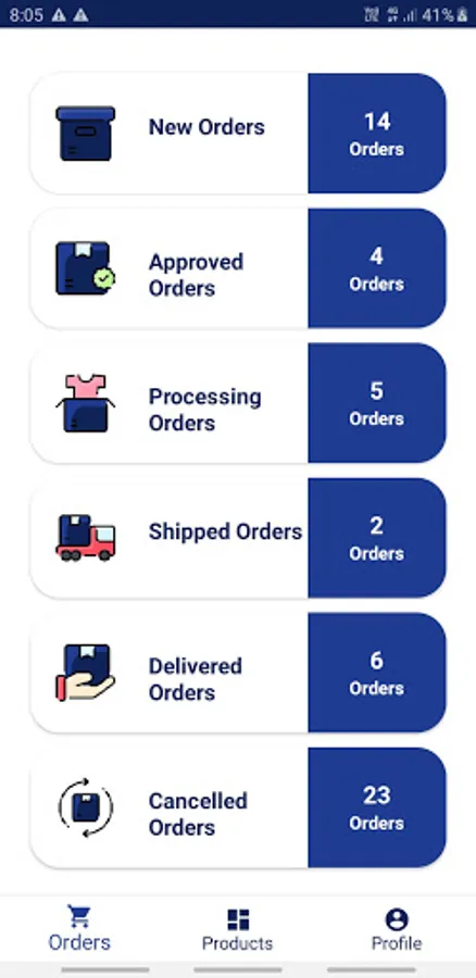 - View and update Order status- new order, approved order, processing order, shipped order, delivered orders, cancelled orders