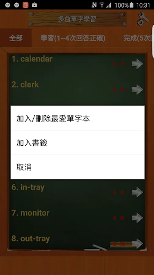 Back word back often today, and tomorrow forget, or do not remember this word a few months later. How do you want to "repeat study" English words, and then into the brain so that the word "long-term memory area" mean? We will need to learn lists of words one by one, these words summed up to "All" this field, you can start a gradual learning each word, through "word quiz" moved to the word "study (1 to 4 times the correct answer ) ", after 24 hours, through" word test "again before" reviewing "these are words to learn new words, continuing to test their familiarity with each word, if" forget "the word, will not increase the number of correct answers, not advance to "completion", there may even return to the "all" list, re-learning. "Wang word memory" for the word to help you do have a learning management system, as long as you spend every day a little time to do piecemeal test, you can achieve the objective of complete learning of English words.