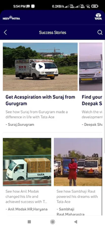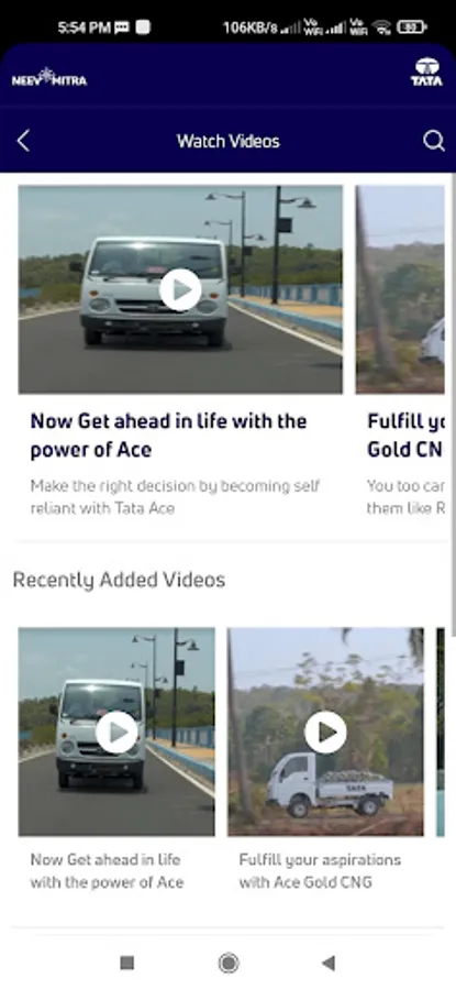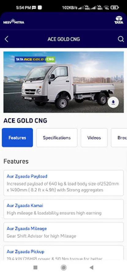 The key purpose of Neev Mitra app is to keep Tata Gram Mitra up-to date about the Commercial vehicles range entailing the details such as product features, its specifications, applications and demonstration videos.