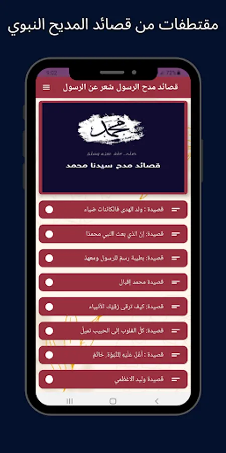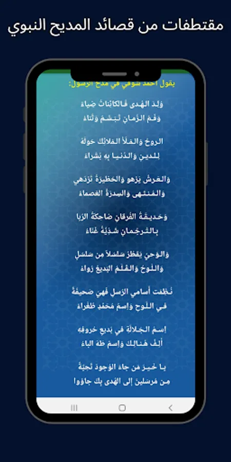 Android application Poems praising the Messenger Poems about the Messenger, through which it displays excerpts from many poems in praise of the Messenger of God, may God’s prayers and peace be upon him, from many poets who wrote poetry about the Messenger and presented poems in praise of the Messenger, may God’s prayers and peace be upon him