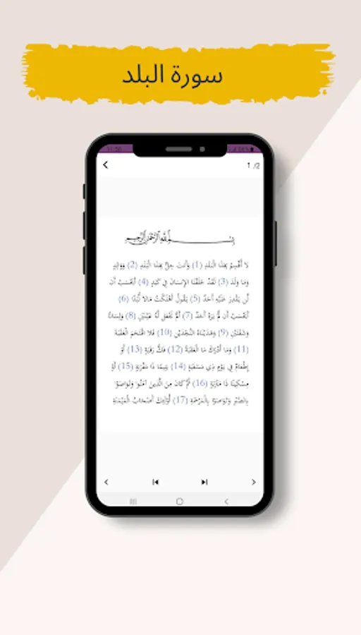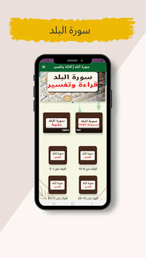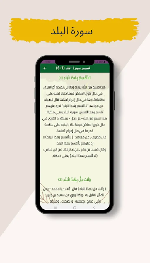 The android application Surah Al-Balad written: tafsir also includes on the interpretation of the twenty verses of Surat Al-Balad, where you can browse the application smoothly and navigate between its pages to access the interpretation of all the verses of Surat Al-Balad