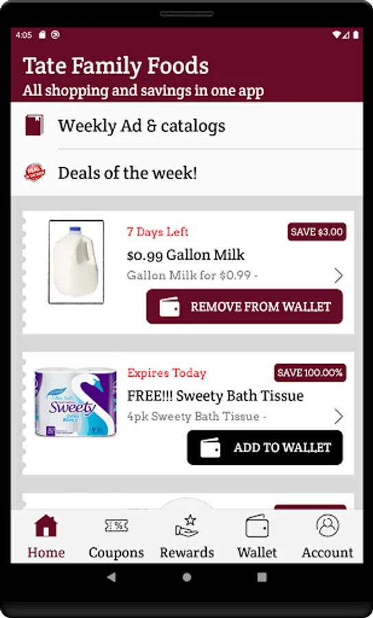 The Tate Family Foods app is the easiest way for our loyal shoppers to receive savings every time they come into the store! It's as simple 1, 2, 3: