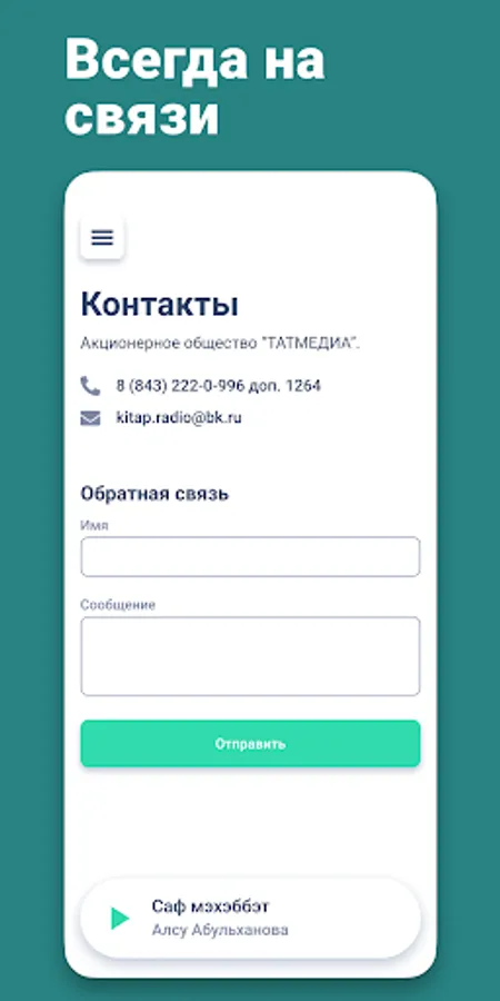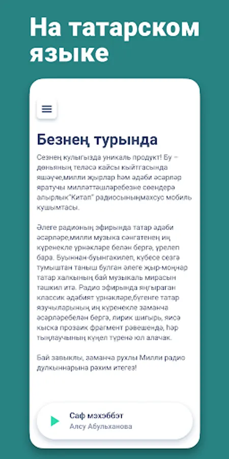 Without moңarchy bilgele tatar telle radiolar gailәsen tulylandyryp, үzenchәlekle әdәbi-musical format asha, milәtkә, tatar sәngatenә hezmәt itәbez. “Kitap” dulkynnarynda halykka yakyn, һәr bәyrәmdә, һәr tabynda esh yңgyry torgan milli monar uryn algan. Boo - һәr keshegә balachaktan tanysh, bashlycha retro yaңgyrashtagy Halyk kөylәre, halykchan moңnar, Ilһam Shakirov, Әlfiya Afzalova, Zәynәb Fәrhetdinova, Salavat Fәthetdinov, Hәniya Fәrhi Québec isemnәre tarihta Bulgan millәt yoldyzlary belәn berrәttәn, bүgenge sәhnәneң sәlәtle vәkillәre bashkaruynda yaңa, tempting yaңgyrashta tyңlauchy kүңelenә yullan.