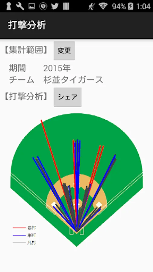 打撃分析画面では打球の方向をビジュアルに分析できます。