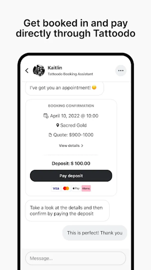 The free Tattoodo app has booking assistants that are ready to help you and connect you with tattoo artists. You can chat to the booking agent who can help you with deciding on the right artist, discuss the design and placement, get a quote, book a date for your appointment and give you up-to-date information about your booking right from the Tattoodo app.