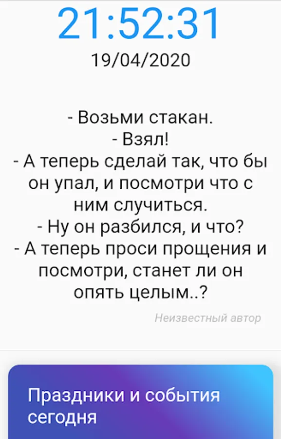 In one touch you will find out what holidays are today, what are the memorable dates, which of the world famous people were born or died on this day. And most importantly, you will get a motivating phrase that will help make your day great!