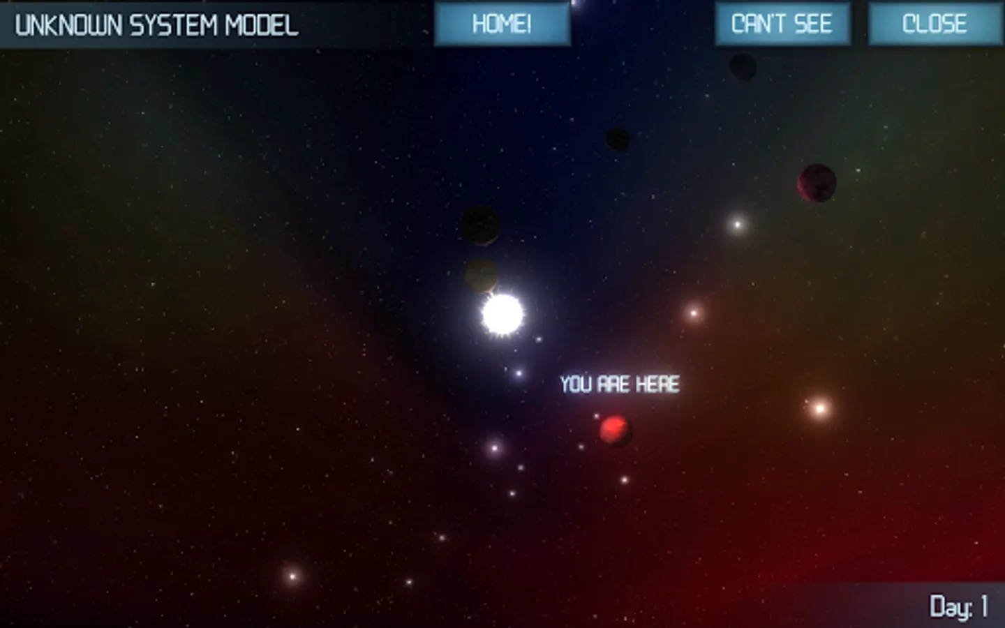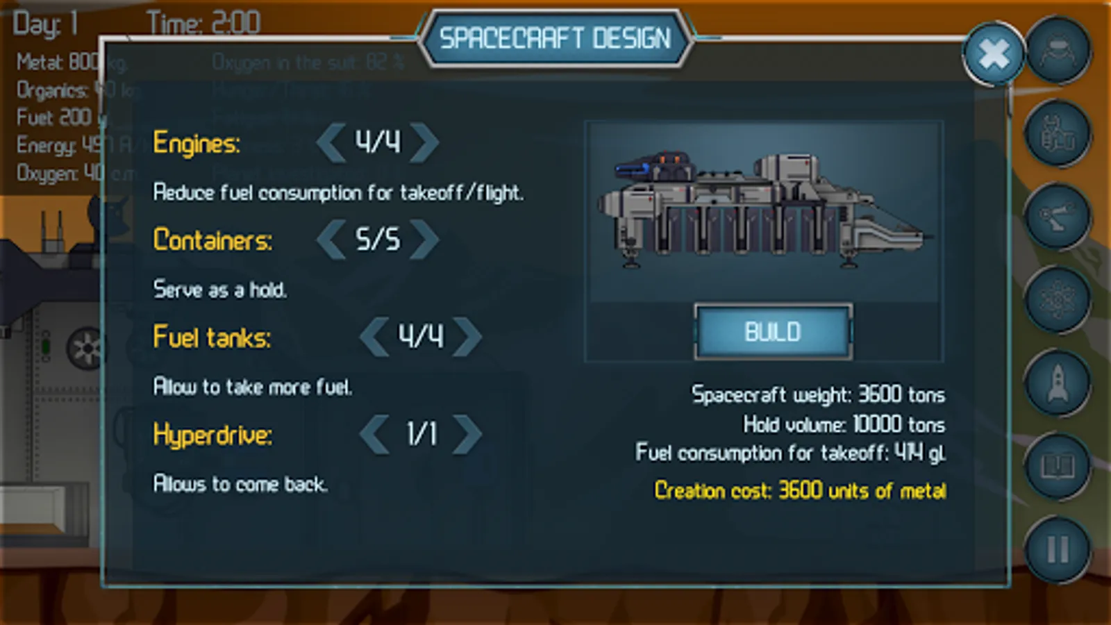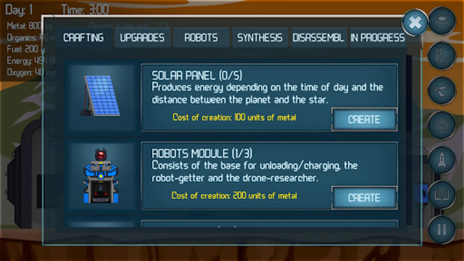 You suffered a wreck in an unknown system due to spacecraft failure. Everything you have is an emergency accommodation module and a heap of scrap. But by good fortune, you are an engineer and you have a clever pair of hands. Upgrade your habitation, build assisting robots, collect enough resources and build a spacecraft. To come home, you will have to visit all planets to determine your current location. In addition, you need to breathe, sleep and eat – remember about it!
