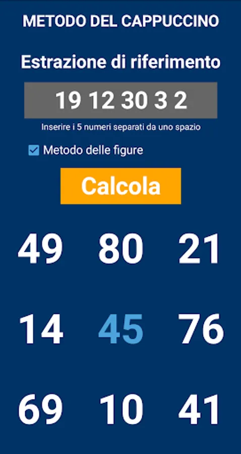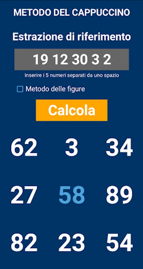 The Cappuccino table is a table from which to draw the predictions for the game of the lotto. It is said that this famous panel was designed by a friar, a certain Father Emidio di Cori. Enter the five numbers of any draw of the eleven wheels; from these numbers the radical number will be calculated (the one in the center of the square) which, together with the numbers obtained from the table, can be brought into play for subsequent extractions such as ambata or ambi.