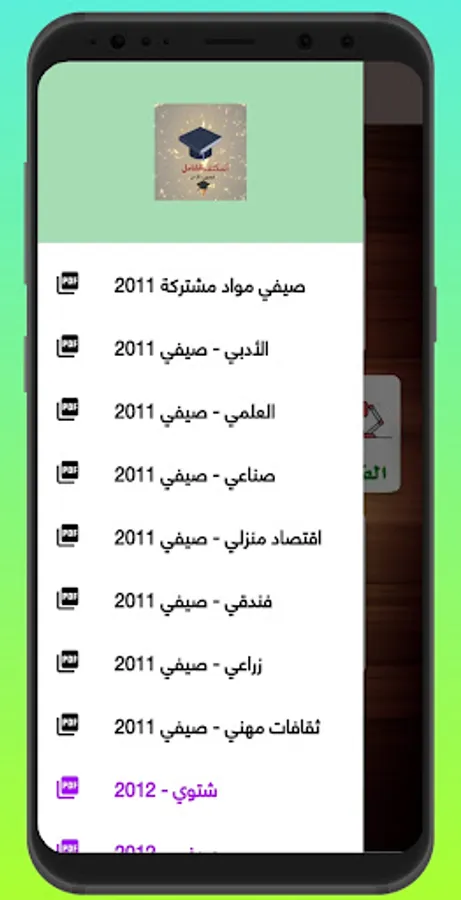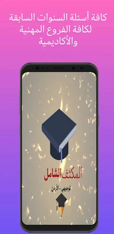 The Comprehensive Intensive Application - Tawjihi, contains questions from the previous years of high school for all academic branches, including the scientific branch, the literary branch, and also for all professional branches, including: the industrial, tourism, hotel, home production, and other branches.
