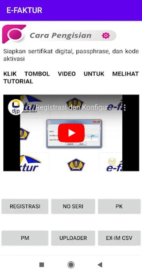 In the Home Application there are 9 Menus, namely: NPWP, PKP, SPT, E-SPT, E-INVOICE, E-BUPOT, E-BILLING, DJPONLINE, OTHER