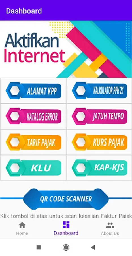 In the Application Dashbard there are 9 more applications, namely: Address and Working Area of the Tax Office, 500 + up Tax Application Error Catalog, Tax Rates, Business Field Classification, PPh 21 Calculator, Reporting and Payment Maturity, Tax Rates, Tax Account Codes and Type Codes Deposit, QR Code Authenticity Tax Invoice.