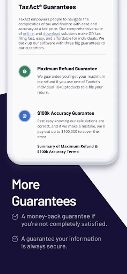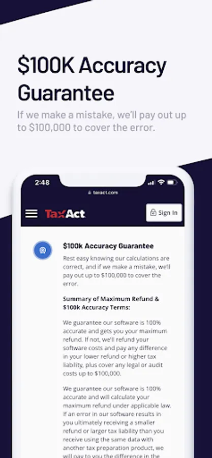 *Maximum Refund and 100k Accuracy Guarantee: If you receive a reduced refund or increased tax liability, or pay penalty or interest because of a TaxAct error, we’ll cover such charges and pay you the difference in the refund or liability up to $100,000. Guarantee only applies to software errors and does not apply to errors attributable to the user. Go to taxact.com/company/accuracy-guarantee for more information.