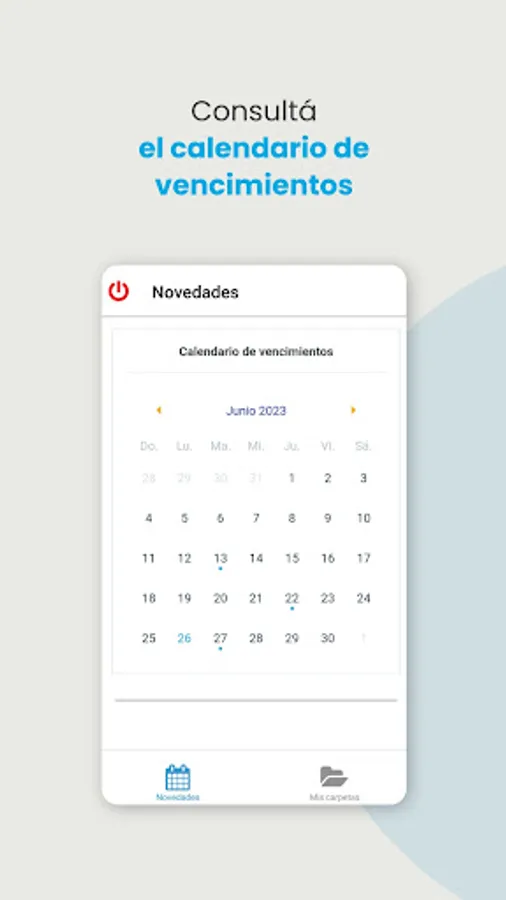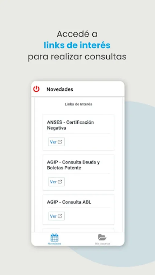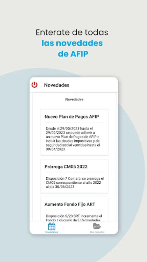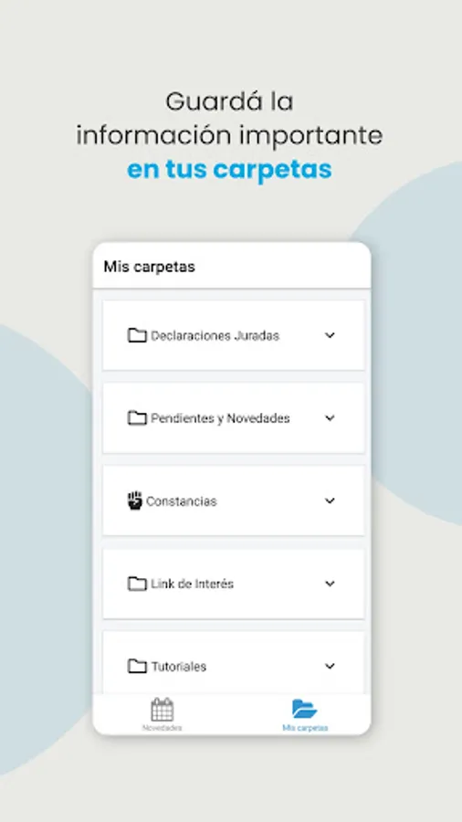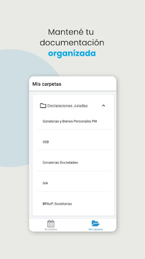 Everything important in a single app. Don't worry about the dates of your next expirations again with our expiration calendar. Organize all your documentation in folders categorized by tax procedure. Find out all the news from AFIP. Make your inquiries through our list of links of interest.