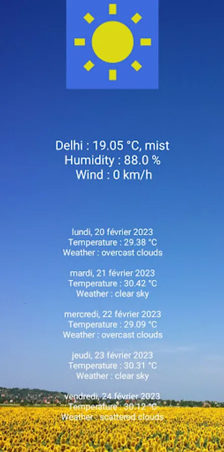 The Météo Delhi application provides weather forecasts for the city of Delhi, for the next 5 days.