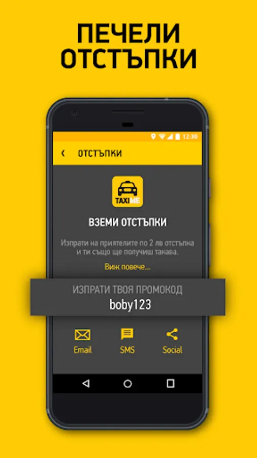 Send friends BGN 2 discount and you will get one, too. Find your personal promo code in the app (Menu/Discounts). Every time a friend signs up with your promo code, they will get BGN 2 discount on their first ride. When your friend tries TaxiMe, you will also receive BGN 2 discount, which will be applied to your account automatically.