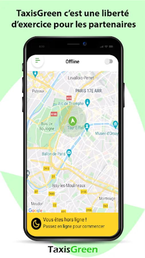 The partner interface allows you to identify yourself as a taxi transport professional, and subsequently after validation, will allow you to receive races on your phone thanks to TaxisGreen which has set up a system of geolocation and receipt of races. You will work when you want and you are in control of your time thanks to the possibility of going on-line or off-line. Payment for the service is made by the race or by the month, at the convenience of the partner.