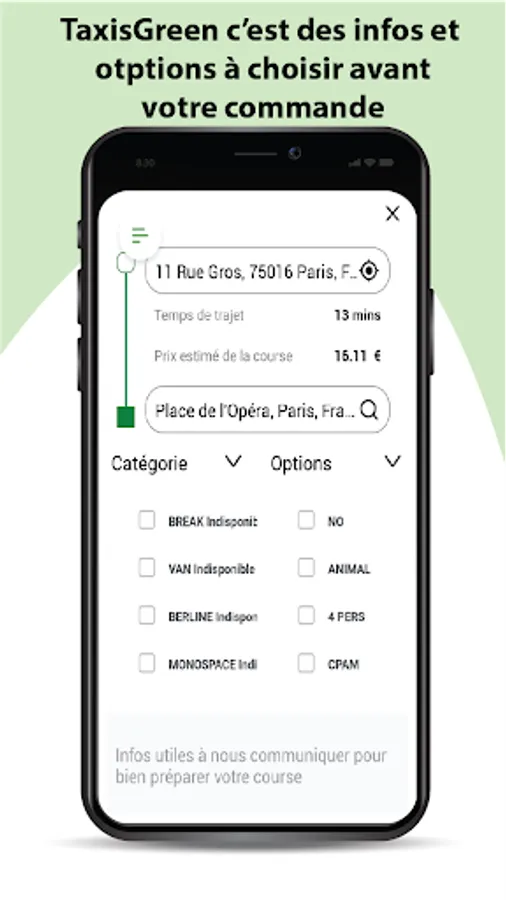 The user interface allows the creation of a user account which gives you the opportunity to take full advantage of the TaxisGreen application and its options. You will have the possibility to order the taxi closest to you, thanks to geolocation but also to choose according to the desired category. Other options are available to you, including the choice of payment.