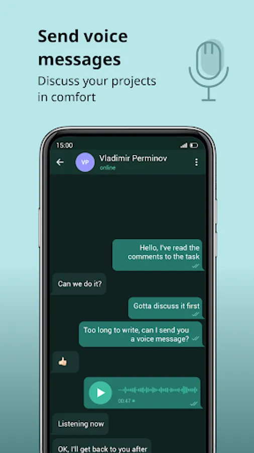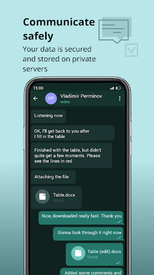 Your chats are protected: the messages you send are encrypted and stored on internal private servers. You can discuss any projects without being afraid of hacks and leaks.