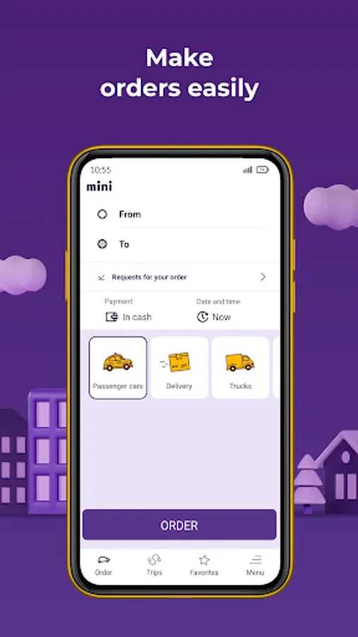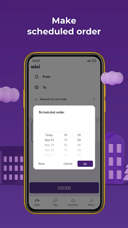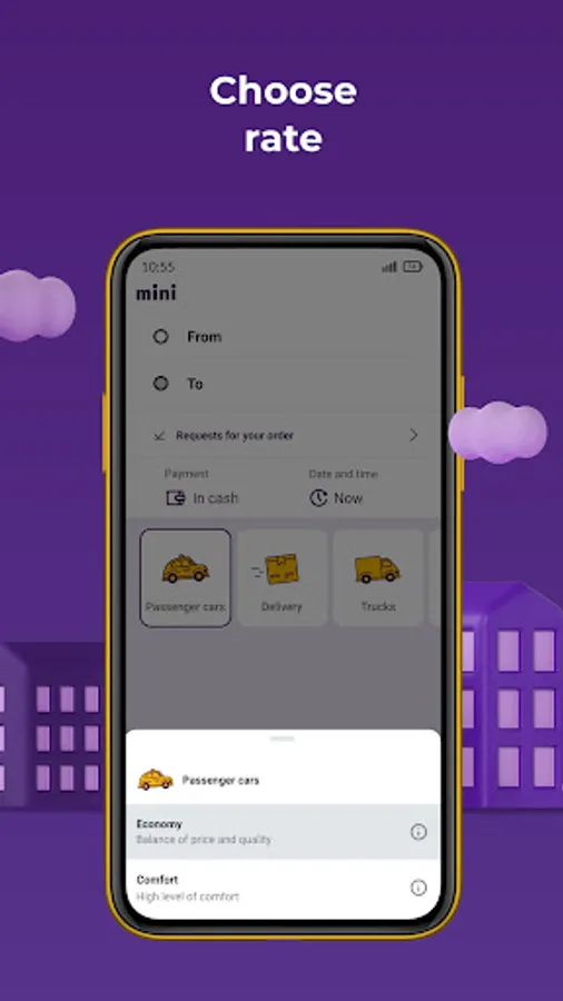 You can order cheap taxi by filling in the From and To address fields or using a city map. A scheduled order helps you plan your rides for a convenient time.