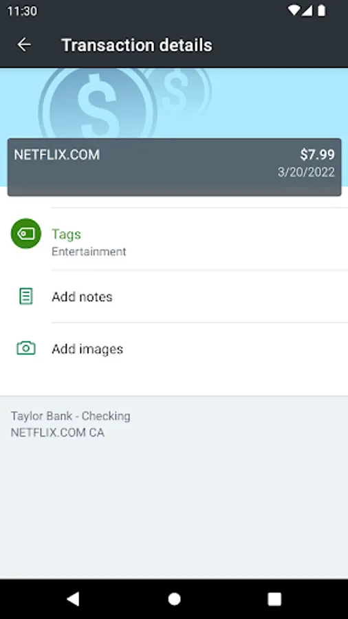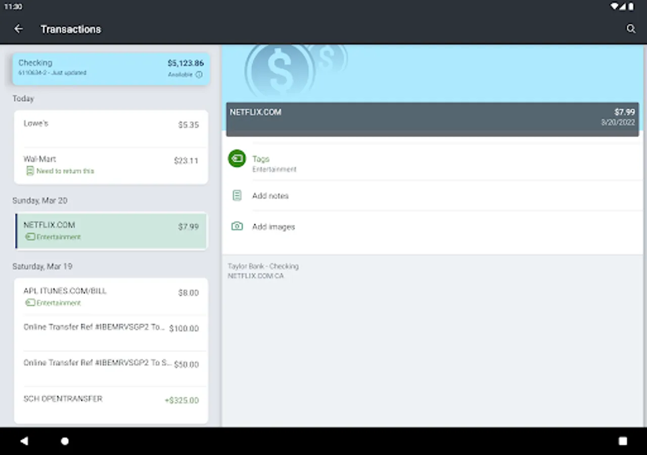 - Keep your transactions organized by allowing you to add tags, notes and photos of receipts and checks.