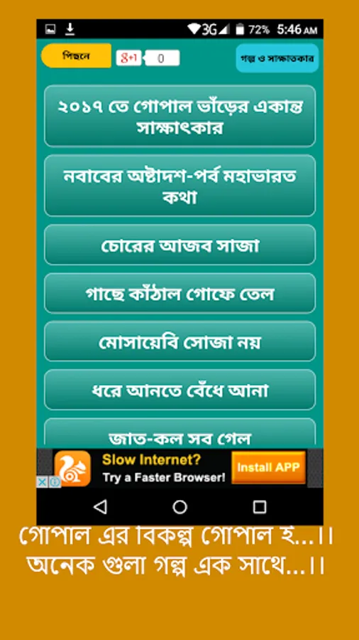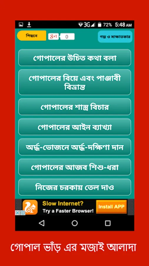 Gopal bhar app is about bangla jokes which also can be mention also as Bangla story or Bangla golpo app. Gopal var is a character of begali jokes which is famous for bengali funny story. This gopal var app is arranged by different types of bangla koutuk,hasir koutuk,mojar koutuk,gopal bhar golpo,koutuk bangla,bangla jokes where reader will found pleasure. It contains various types of funny jokes and story of gopal var by which reader can imagine the gopal var video or cartoon gopal bhar video.The content of this bangla funny jokes app are very amusing which entertain you with smile. So stay with this app and get a pleasure moment with smile.