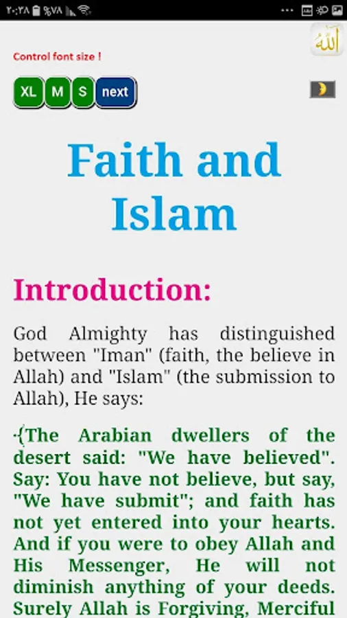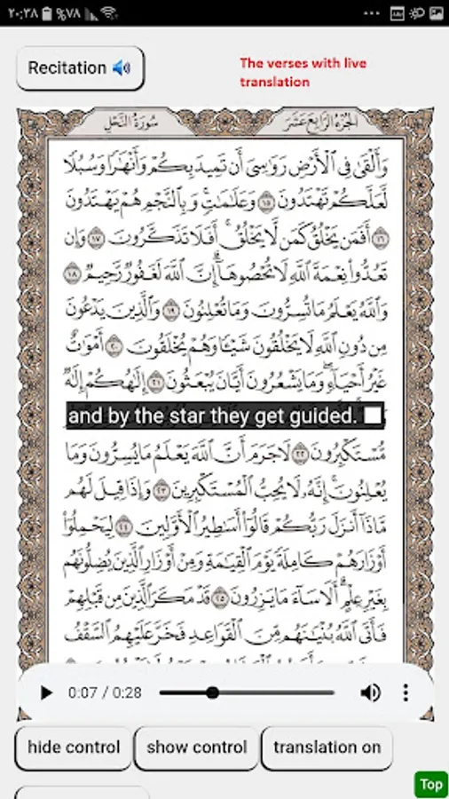 Our Honorable reader must accept, that the translation of any text, will invariably shave off some of its original essence and meanings, and as it comes to the words of God, our human shortage become more evident. So, this translation could only be taken as one interpretation of the verses of holy Quran, and not the verses themselves, and we have provided in this app the original Arabic pages of the Quran of the mentioned verses in addition to the Arabic recitation of these verses, for the scholars and academic researchers.