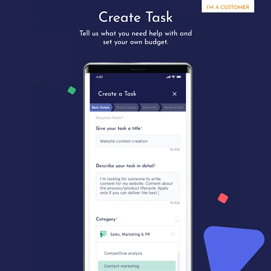 Select the category you have a task in, give a few details about your task, and set a price range.