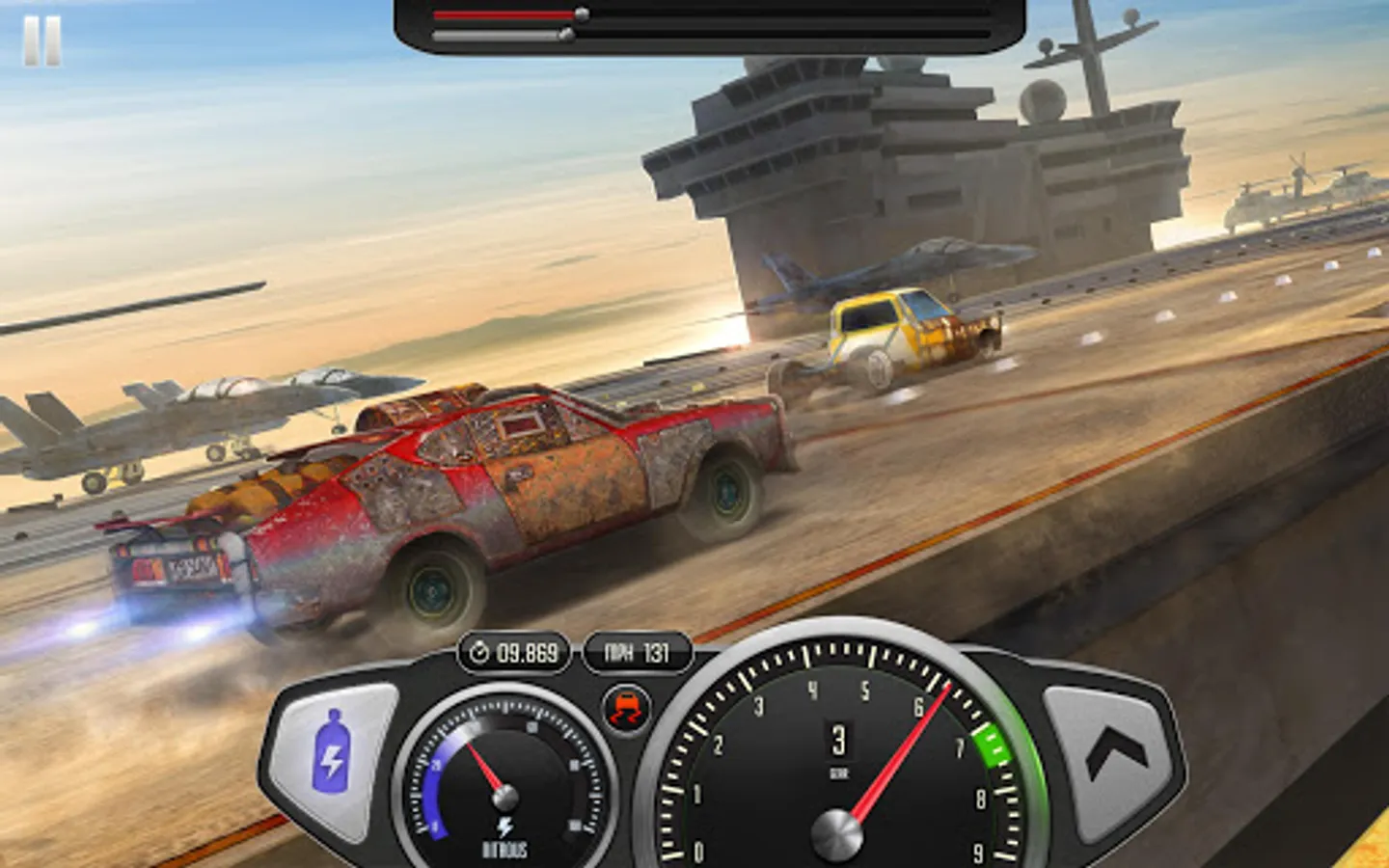 Race as fast as you can on the abandoned aircraft carrier and dominate your opponents! Learn when to shift gears for the fastest acceleration! Reach impossible speed in indestructible, devastated vehicles and become UNSTOPPABLE using NITRO!