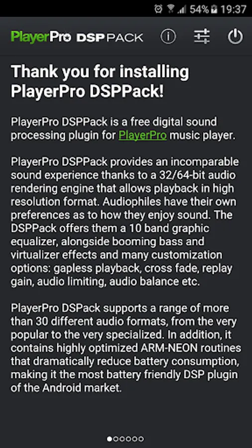 PlayerPro DSPack supports a range of more than 30 different audio formats, from the very popular to the very specialized. In addition, it contains highly optimized ARM Neon and X86 routines that dramatically reduce battery consumption, making it the most battery friendly DSP plugin of the Android market.