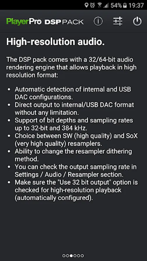 * From PlayerPro app, go to Settings > Audio and check the "Activate the DSP pack" option. Alternatively, if you are performing an upgrade, you need to click on the "Upgrade the DSP pack" option.