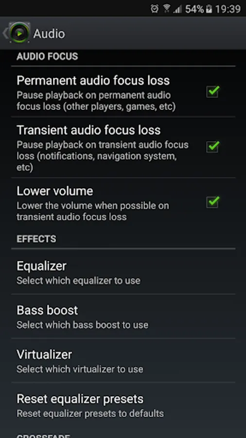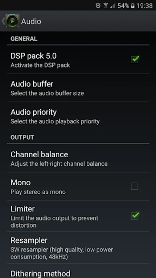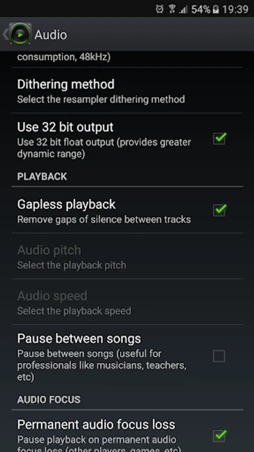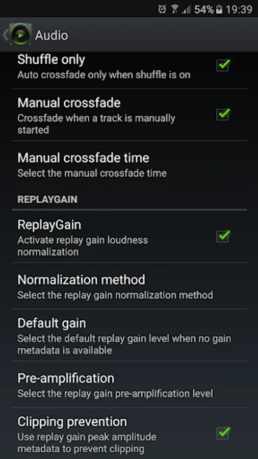 * Use the audio settings menu to customize your preferences: adjust manual and auto crossfade time, activate gapless or replay gain, adjust left-right volume balance, adjust resampling/dithering options etc.