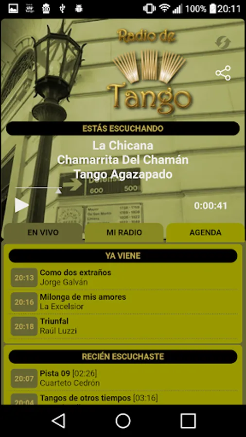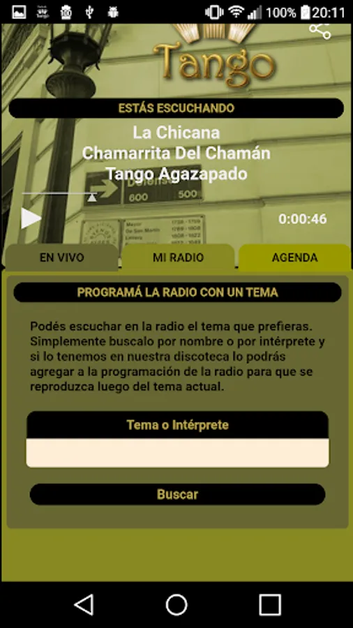 Radio de Tango is an online station that broadcasts the music of Buenos Aires, tango, 24 hours a day, 365 days a year. You can listen to all the artists and you can also request the songs you like using the interface that is in the app.