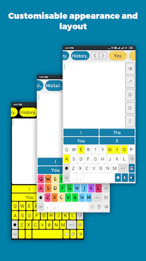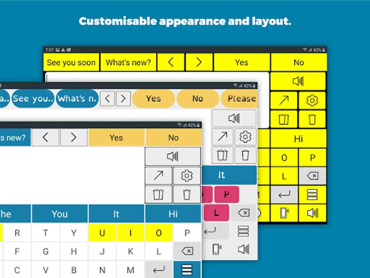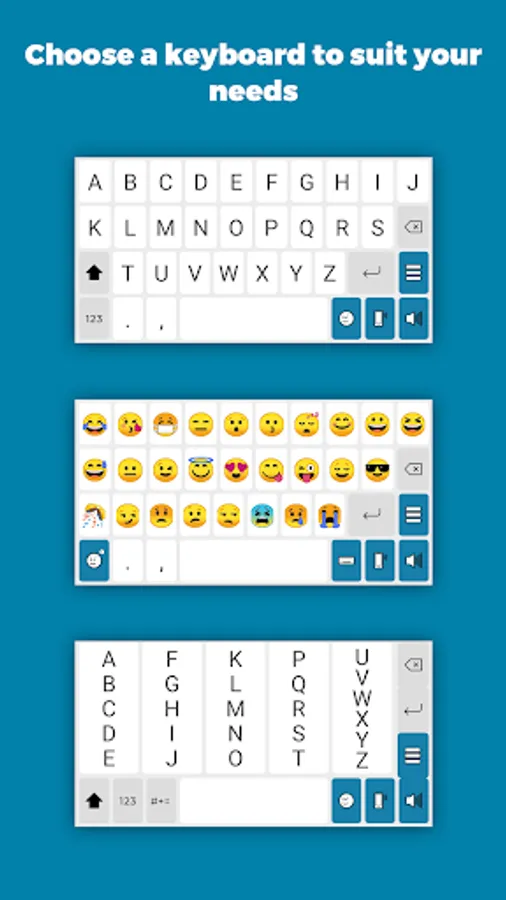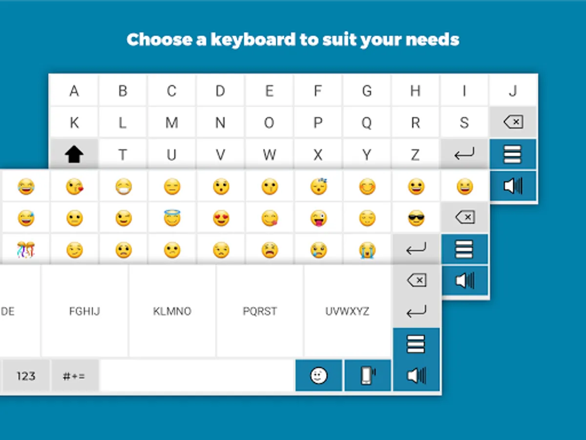 Different keyboard options to choose from (10 Key, QWERTY, ABCD, High Frequency, Apple and any other Bluetooth or downloadable keyboard).