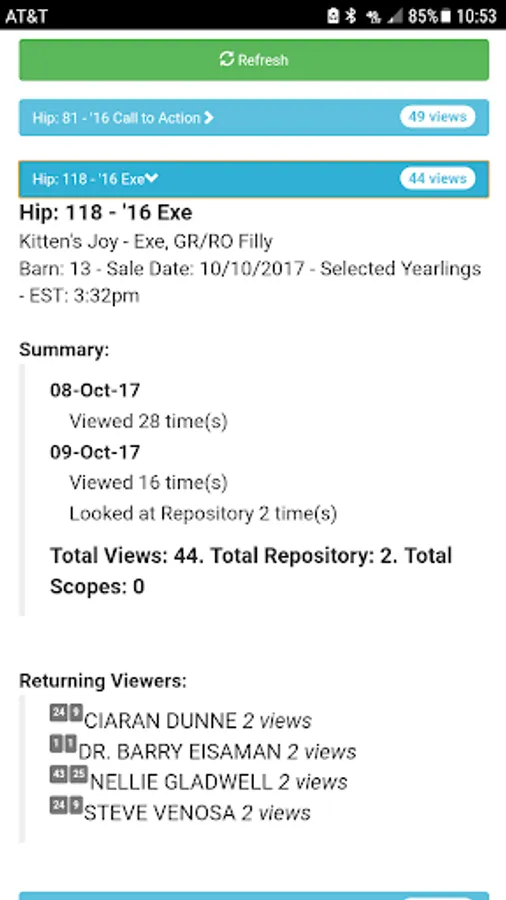 Blue buttons indicate horses that have not yet gone through the ring. Click on any button to see a summary of how many views, looks into repository, scopes, x-rays, etc for that hip. Below the summary you will see a list of "returning viewers" (i.e., viewers who came more than once to look at the horse).