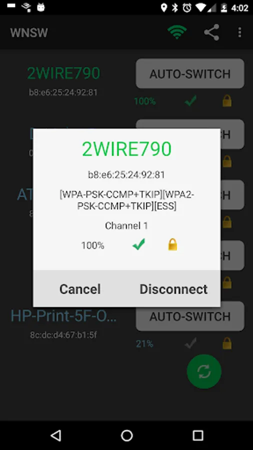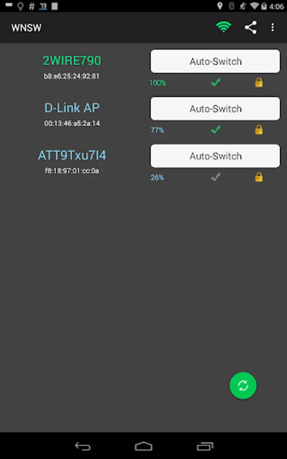 APSwitcher will list the two access points with the strongest signals, giving priority to networks that you have already configured. Touch a network once to connect!