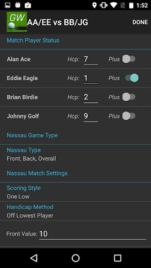 Golf Wager, formerly 'Golf Scoring Buddy', is a virtual golf scorecard application for the. It delivers in real time the scores and status of all side bets within the group. It is extremely flexible and loaded with options including: flexible starting hole, allows five-somes, allows plus handicaps, automatic and manual presses, flexible handicaps per match, team bets. Golf Wager eliminates the constant struggle of remembering what holes who gets how many strokes. No longer should one scoring error on the front nine require an accountant to reconcile the entire scorecard. With Golf Wager you can now focus on the golf, not the score keeping.