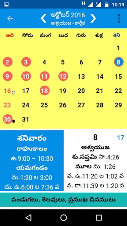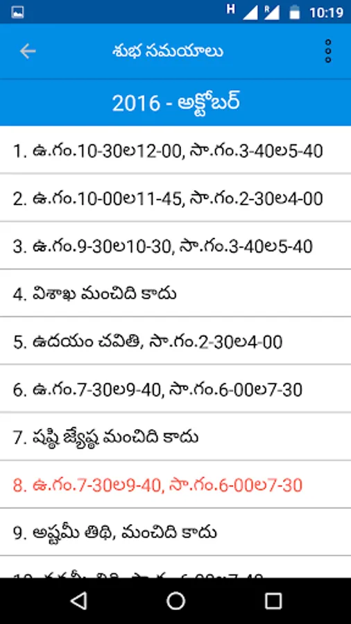 4. Shubha samayaalu were listed for all the 365 days and highlighting current day .