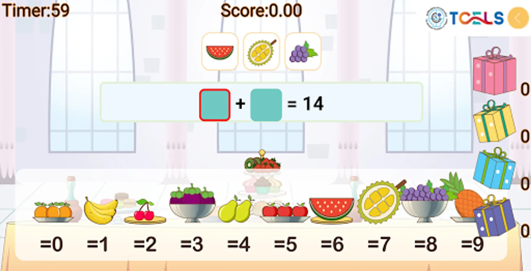 The scene at the fruit party, there was a game to find answers between the royal family in the castle. By setting up the answer and having Rajasong finding numbers to put in order for the equation to get the correct answer The numbers are represented by different fruits. Calculation with + - and x increases the challenge. Each level has 12 levels.