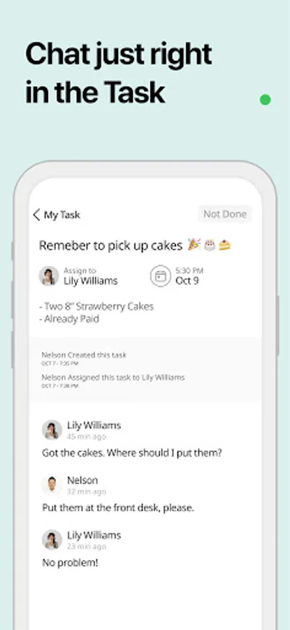 People always forgot the task you asked them to do? You should try TChat! Easy to create and assign tasks to people. TChat will keep remind them to finish your tasks.