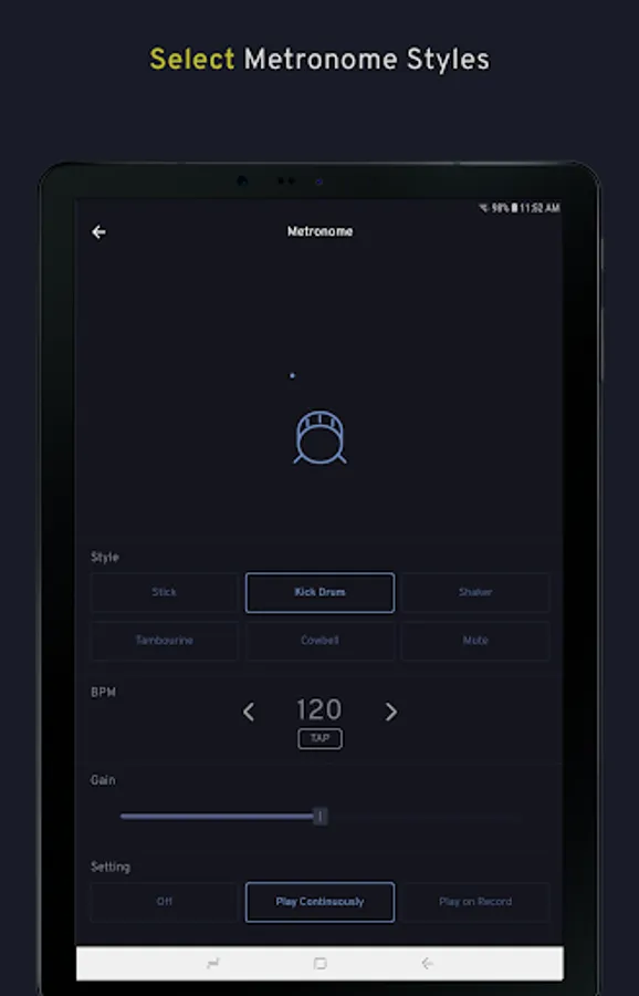 * Select from a wide variety of Metronome styles including stick, kick drum, shaker, tambourine and cowbell.