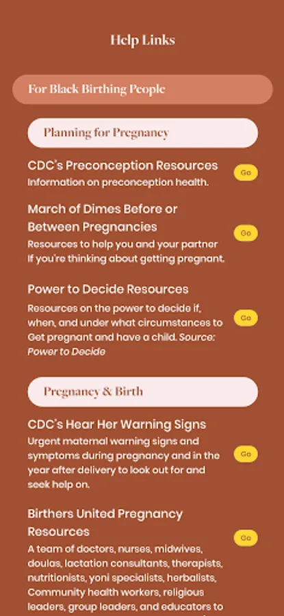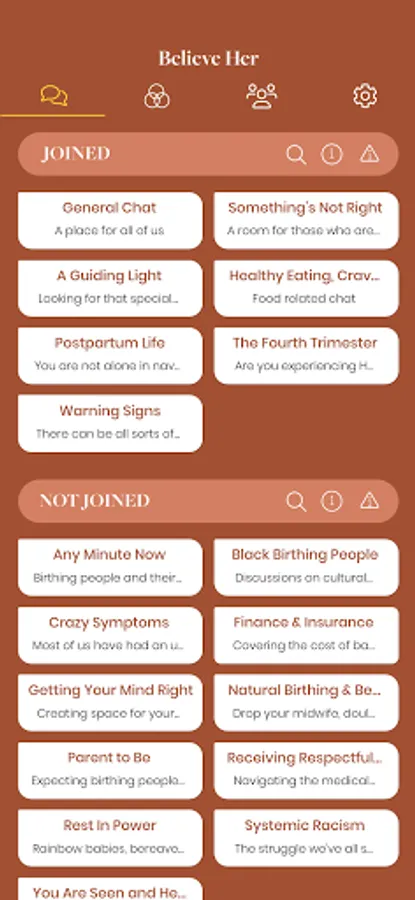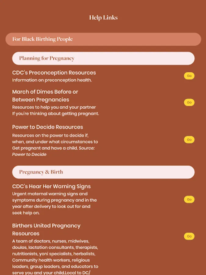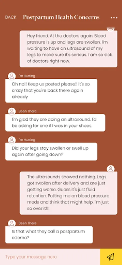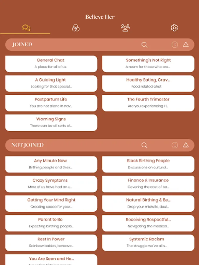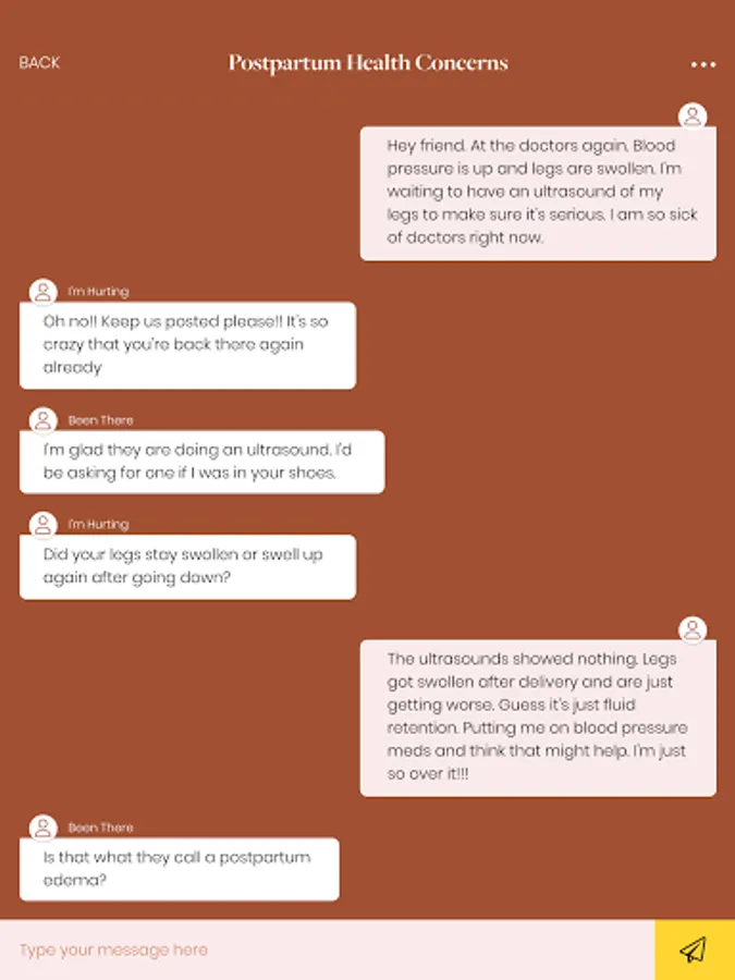 • Specific “rooms”/categories like Postpartum Life, Crazy Symptoms, and more to chat anonymously with black maternal peers and resources.