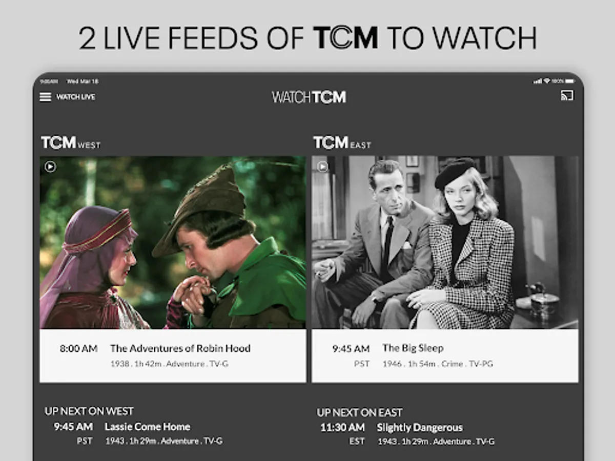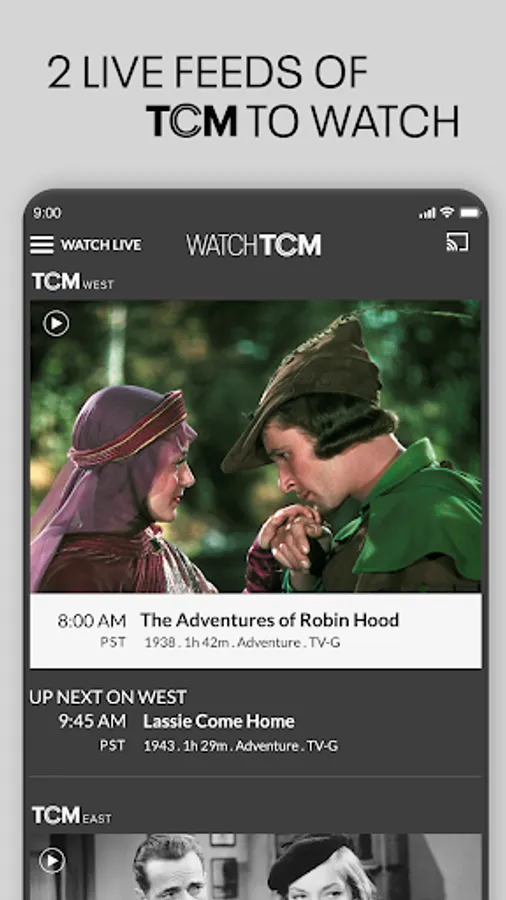 TWO LIVE STREAMS: Enjoy both an East and West Coast feed of Turner Classic Movies. Watch 2 different movies LIVE at any time, always UNCUT and COMMERCIAL FREE.