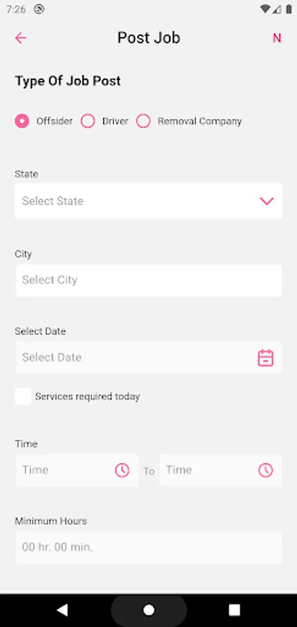 When a person creates a job then they have to fill in details like Name, Type of job post, select state, city, date, time, minimum hours, rate per hour/ fixed amount, truck Length, pickup location, delivery location, qualification, and special notes(optional).