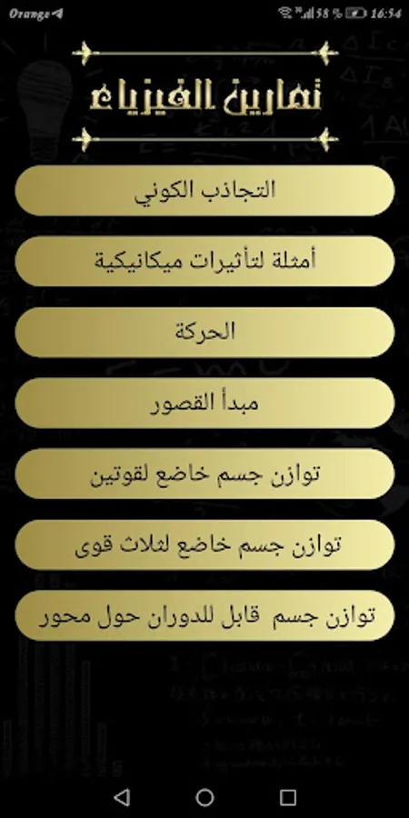We put in your hands this free application that provides you with solved exercises to understand the lessons of physics and chemistry, a common scientific stump, and here we talk about lessons: cosmic attraction, examples of mechanical effects, a lesson of motion and the principle of inertia, and there is also a lesson on the balance of a body subject to two forces (the force applied by a spring - the impulse of Archimedes) and equilibrium A solid body subject to three non-parallel forces and equilibrium is a solid body that can rotate around a tabular axis.
